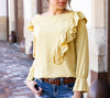 We are in love with ruffles this season! And our Addison Ruffled Blouse does not disappoint! It's a playful, hip sweet look that can be dressed up or down and worn for any occasion. It features a diagonal ruffle down the front and the back and a capped ruffle on the shoulder. The softly gathered hem at the wrist finishes off the look!