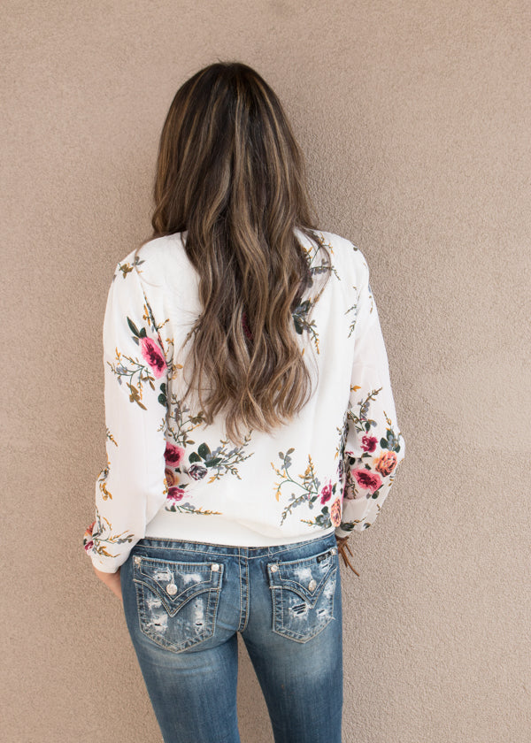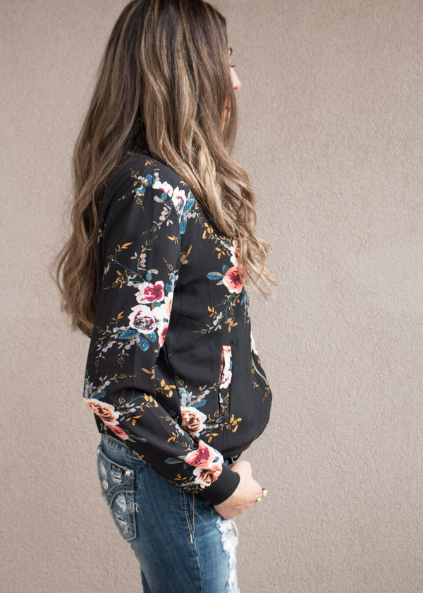 Dress in style with our beautifully hip Lightweight Floral Bomber Jacket! You can't go wrong when you pair it with your favorite jeans and t-shirt! This beautiful piece is classic with a modern hipster vibe added in.
